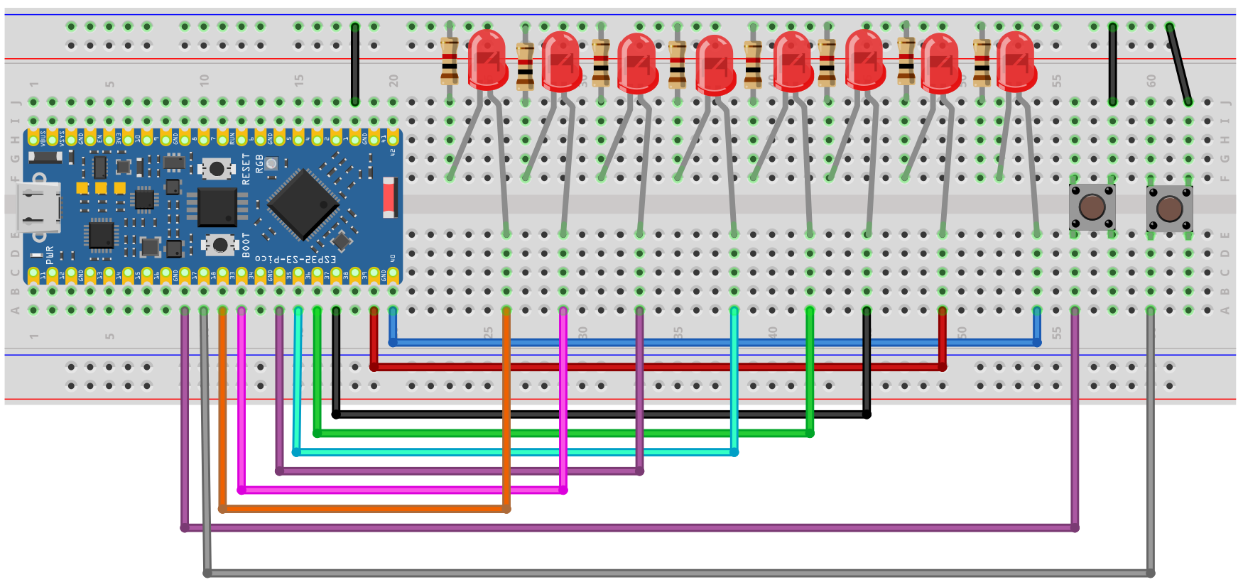 In the previous tutorial, we built the Knight Rider / LiDAR Scanner effect using a row of LEDs that sweep left and right. Now, we'll make it more interactive by adding two buttons that let us control the speed of the LED movement.
