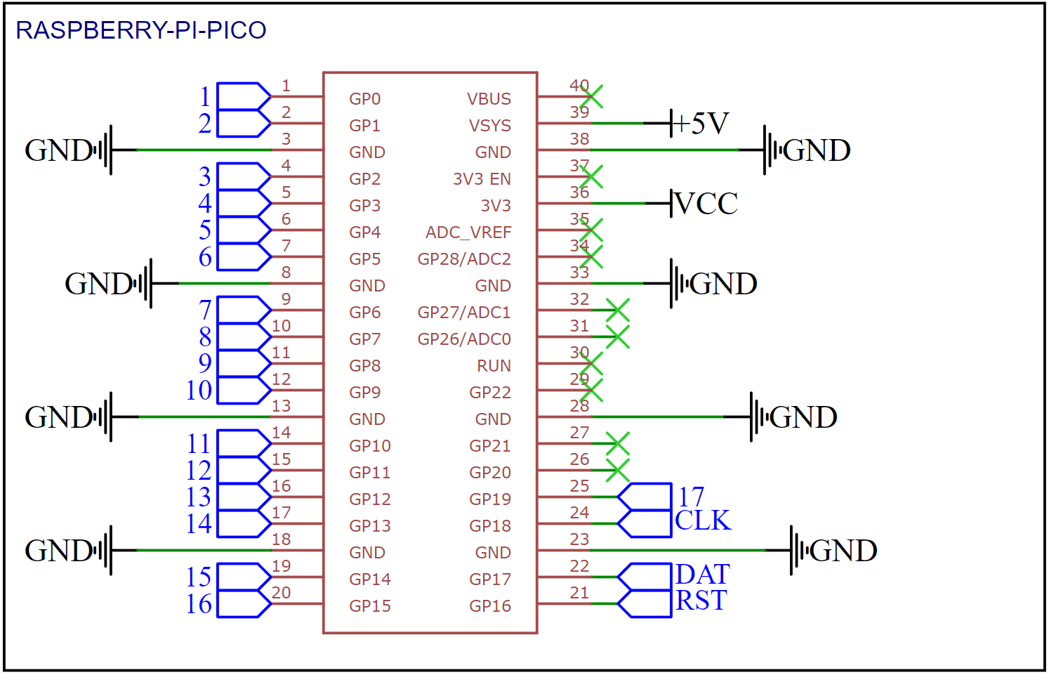 The following schematic diagram is design to be used with the Raspberry Pi Pico with an external DS1302 RTC. In this tutorial we will be using the Raspberry Pi Pico W and will not need to have external RTC. The diagram will be shown in sections.