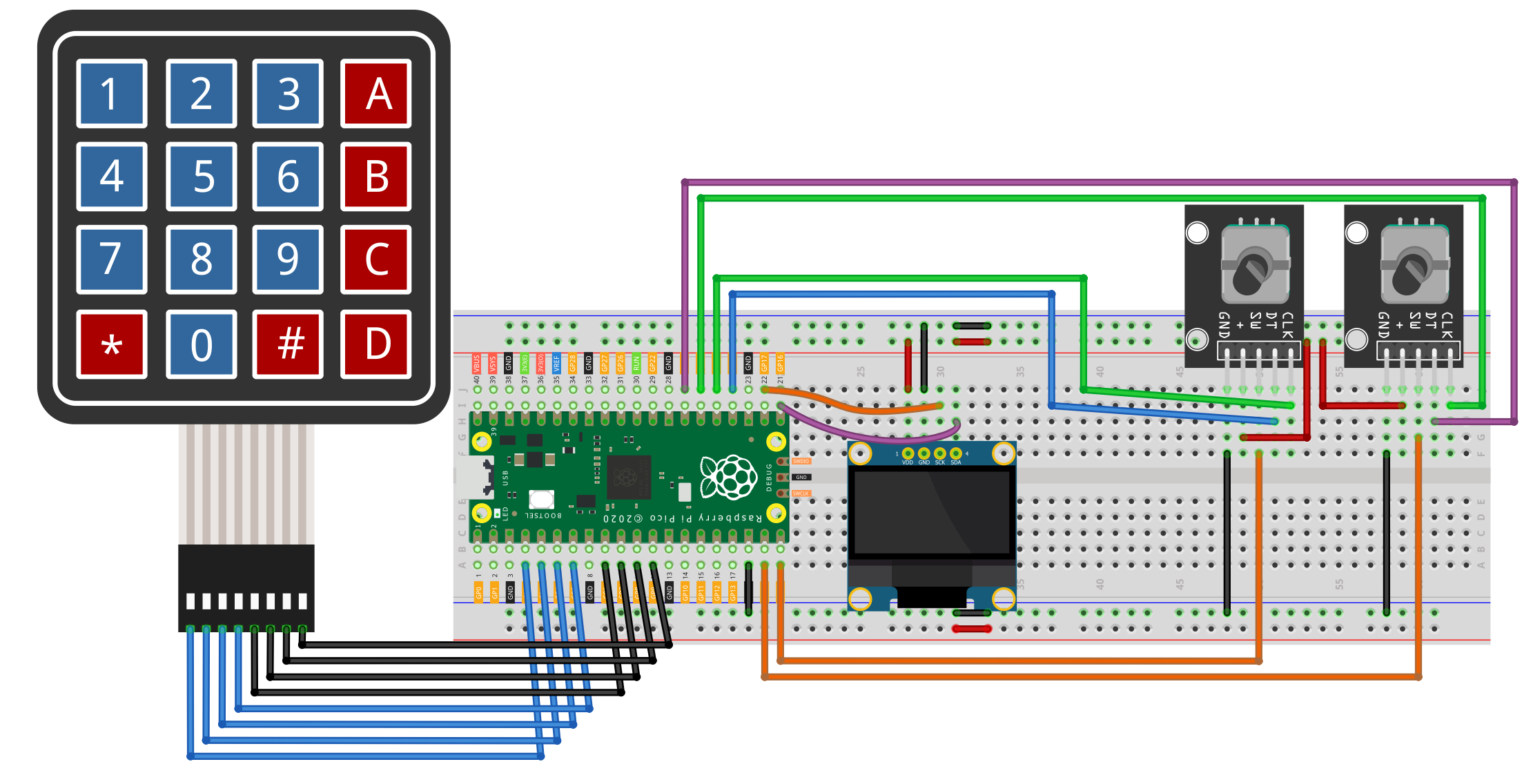 The schematic diagram is shown below. The design is straightforward as each button was connected to a GPIO pin to the Raspberry Pi Pico