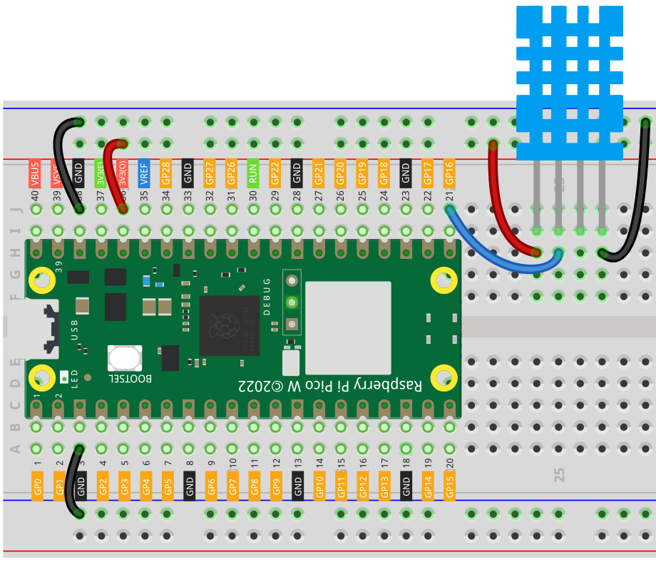 The DHT11 is a low-cost digital humidity and temperature sensor module that uses a thermistor and a capacitive humidity sensor to measure the surrounding air's humidity and temperature. The module has a single-wire serial interface, making it easy to interface with microcontrollers such as the Raspberry Pi Pico.